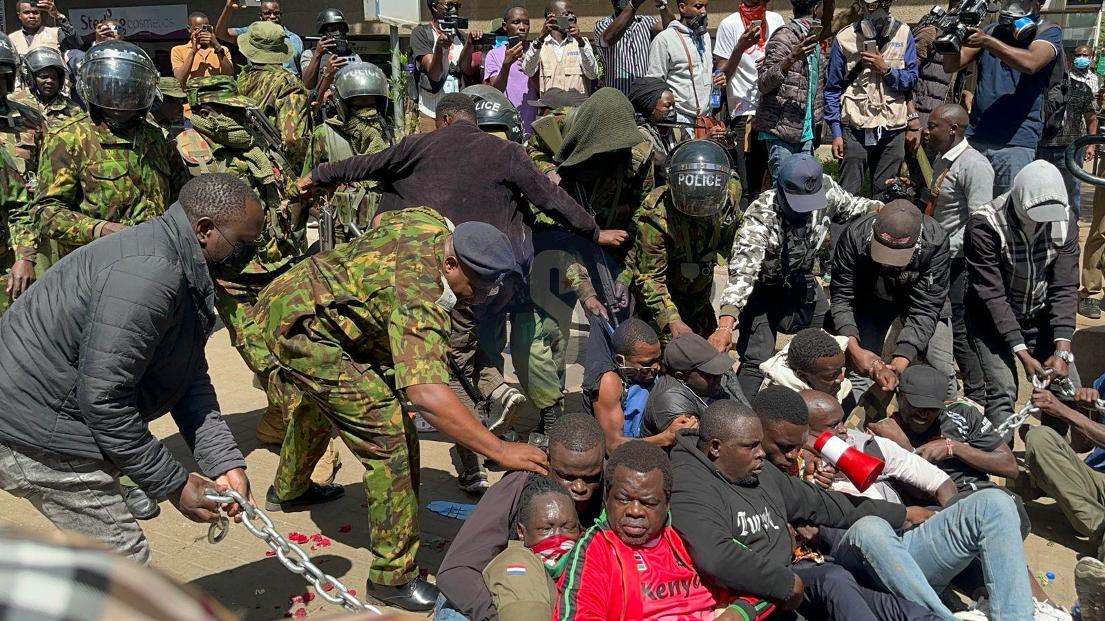 NAIROBI: Anti-abduction protests in Nairobi on Monday took a dramatic turn when Busia Senator Okiya Omtatah and a group of protesters used a heavy-duty metal chain to block an arrest by police officers deployed to control the crowd.